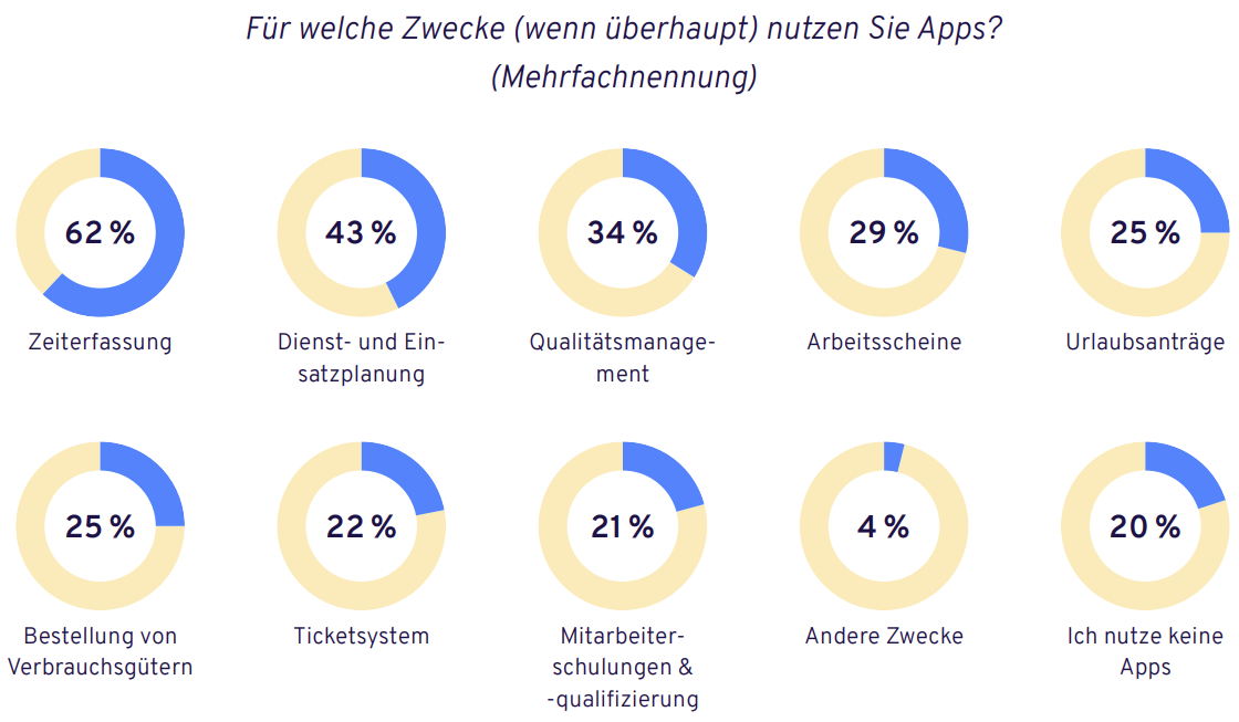 Vor allem bei der Zeiterfassung (62 Prozent) haben sich Apps etabliert, aber auch beim Qualitätsmanagement boomen sie mit einem Plus von satten 19 Prozentpunkten im Vergleich zum Vorjahr. Apps übernehmen in den verschiedensten Bereichen des Arbeitsalltags zunehmend mehr Aufgaben – von der Dienst- und Einsatzplanung (43 Prozent) über Arbeitsscheine (29 Prozent) bis hin zu Urlaubsanträgen (25 Prozent).
