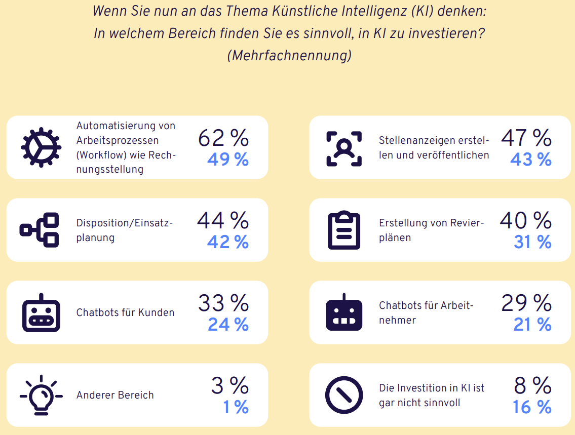 Die Branche weiß inzwischen, dass KI weit mehr ist als ChatGPT. Nahezu zwei Drittel (62 Prozent) sehen in der KI-gestützten Prozessautomatisierung – etwa bei der Rechnungsstellung oder der Validierung von Stundenzetteln – die lohnendste Zukunftsinvestition. Im Vorjahr waren es noch 49 Prozent. Auch beim Entwurf von Stellenanzeigen (47 Prozent), der Disposition (44 Prozent) und der Erstellung von Revierplänen (40 Prozent) sieht die Branche enormes Potenzial. Das Problem liegt nicht im Erkennen. Es liegt im Machen.